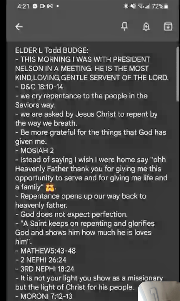We had the visit of another General authority, Elder Budge of the Quorum of the Seventy. He gave a 40 minute talk. It shocked me to see how much information he put into his talk. I think his preparation took a Iot of work and I appreciate it. I have to say it was an amazing experience. He shared a few ideas that I loved.